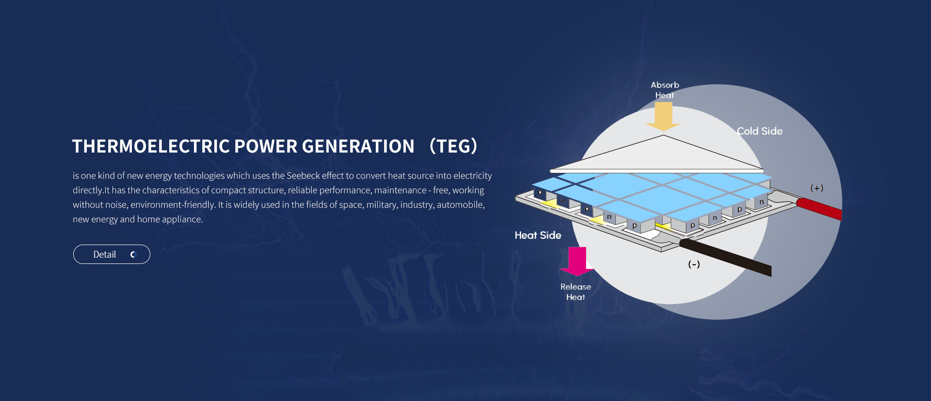 uses the Seebeck effect to convert heat source into electricity directly. It has the characteristics of compact structure, reliable performance, maintenance - free, working without noise, low-carbon and green, and widely used in the fields of space, military, industry, automobile, new energy and home appliance. ...